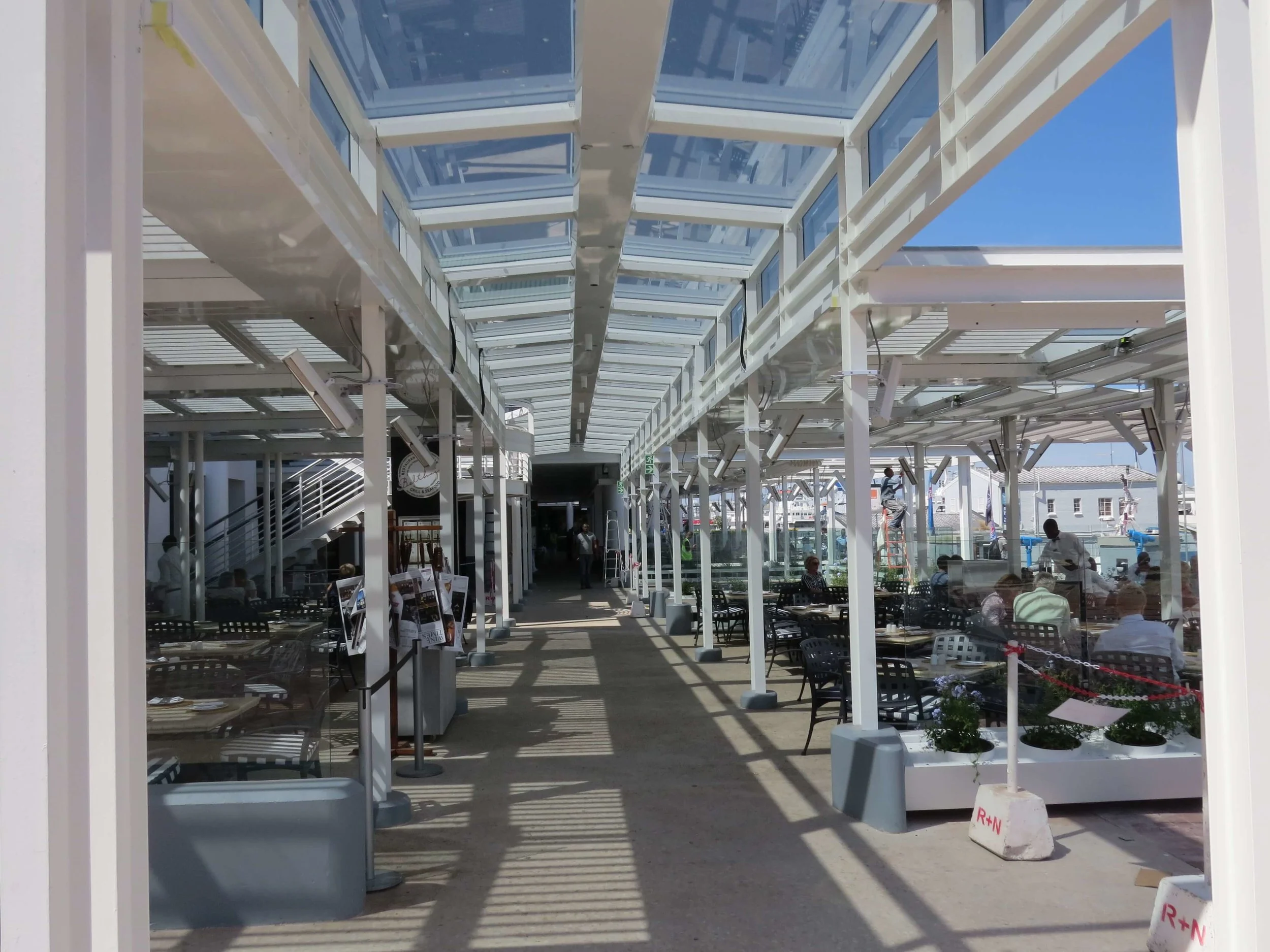 Victoria Quayside comprises of a steel and glass covering to the external concession spaces for the restaurants on the quay side of the V&A Victoria Mall. It will replace the sea of umbrellas that used to crowd the space. It will incorporate retractable blinds and aluminium slats and provide shelter to diners eating at tables outside.